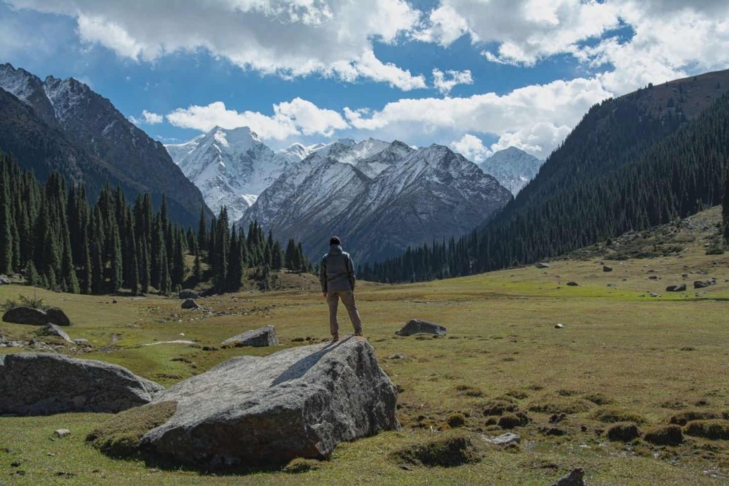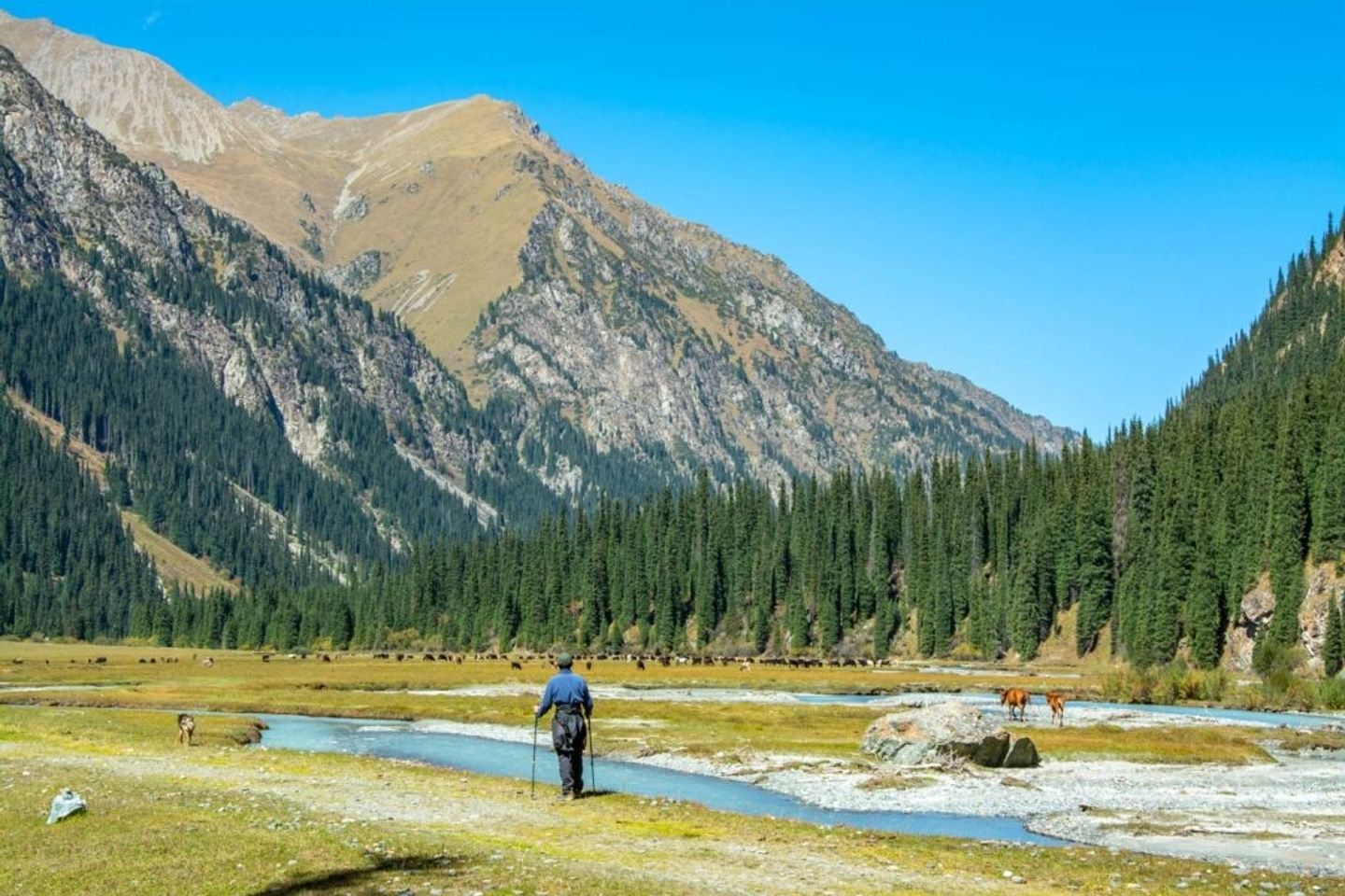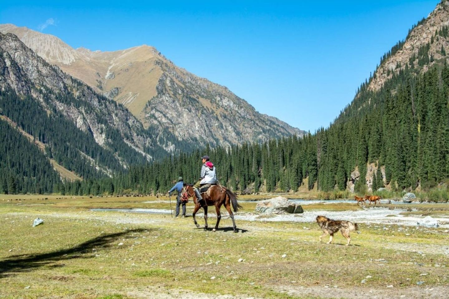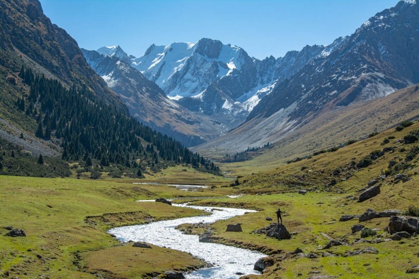 After reaching the pass, enjoy a well-deserved break and take in the spectacular views before starting your long descent into the Altyn Arashan Valley. The trail winds down through rocky slopes and alpine meadows filled with wildflowers, gradually leading into a lush valley framed by dense spruce forests.