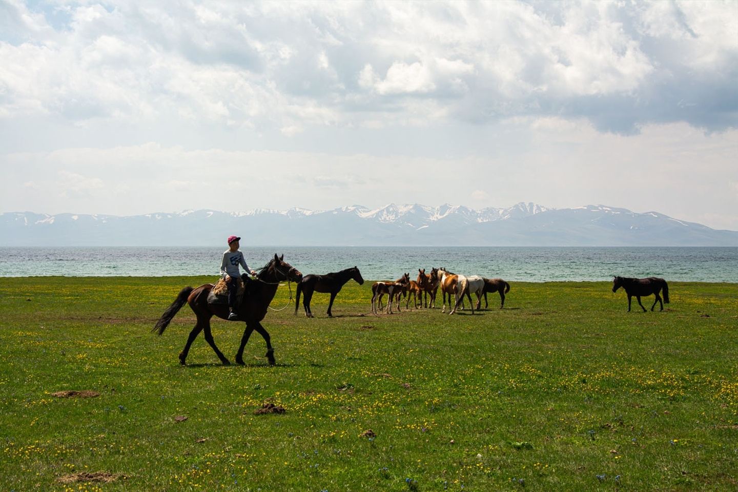 After breakfast at Kilemche, spend the morning climbing to Jalgyz Karagai pass (3400 m), over the Song-Kol Mountains, and into the lake’s basin. The morning climb affords wonderful views of Kilemche jailoo, and the pass itself is rocky and exciting. From the pass, Song-Kol is still distant, but as you traipse down the slopes, it gets larger and larger; the mountains on the other side get higher and higher, until finally, the lake fills most of your field of view, and the southern mountains tower above it. Follow the lakeshore west to the yurt camp at Tuz-Ashuu summer camp for lunch. After lunch, we ride about 2-hours along the lake shore with many shepherds busy with daily activities. Upon arrival, meet your host family of Kyrgyz shepherds. Meals and overnight are in a yurt of shepherds.
